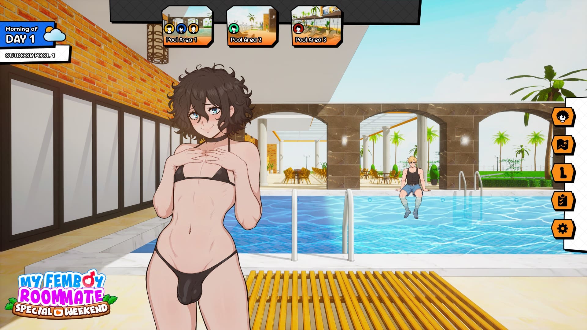 Participate in the numerous activities and events taking place across the resort, where you and Robin bond and grow closer throughout your trip. Meet new people, such as Demi, the resort’s femboy receptionist, and Alex, a nervous jock.
