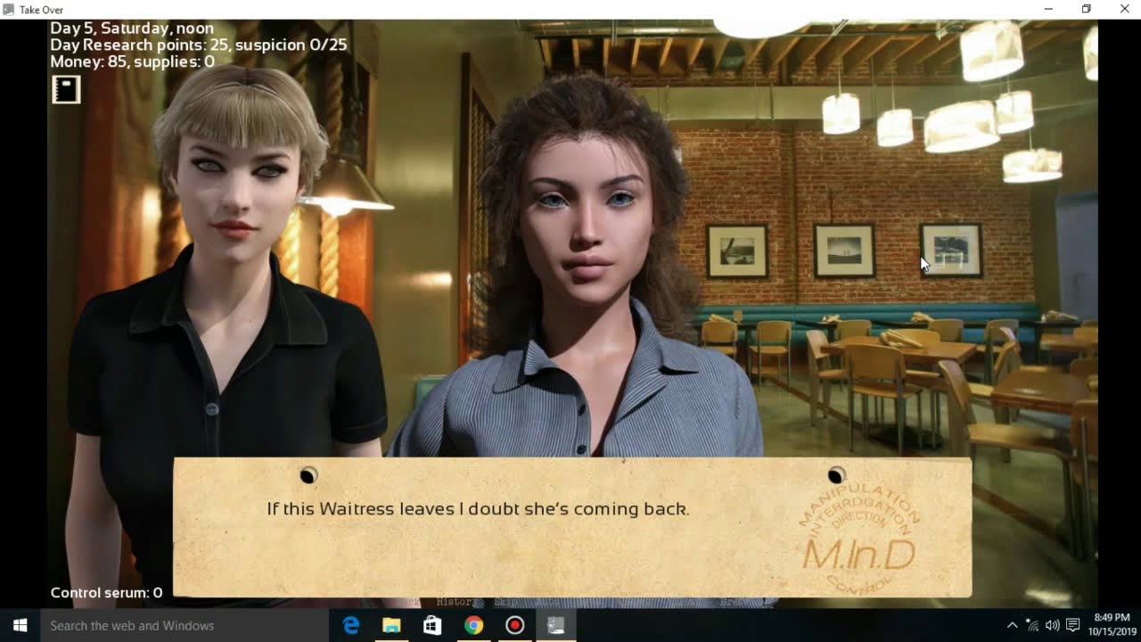 Take Over is a game about corruption, where you need to be careful about being caught by the oppresive government. Mind control the people in town, use them and their influence in your favor, or put them to work to get resources and money, and finally take over.